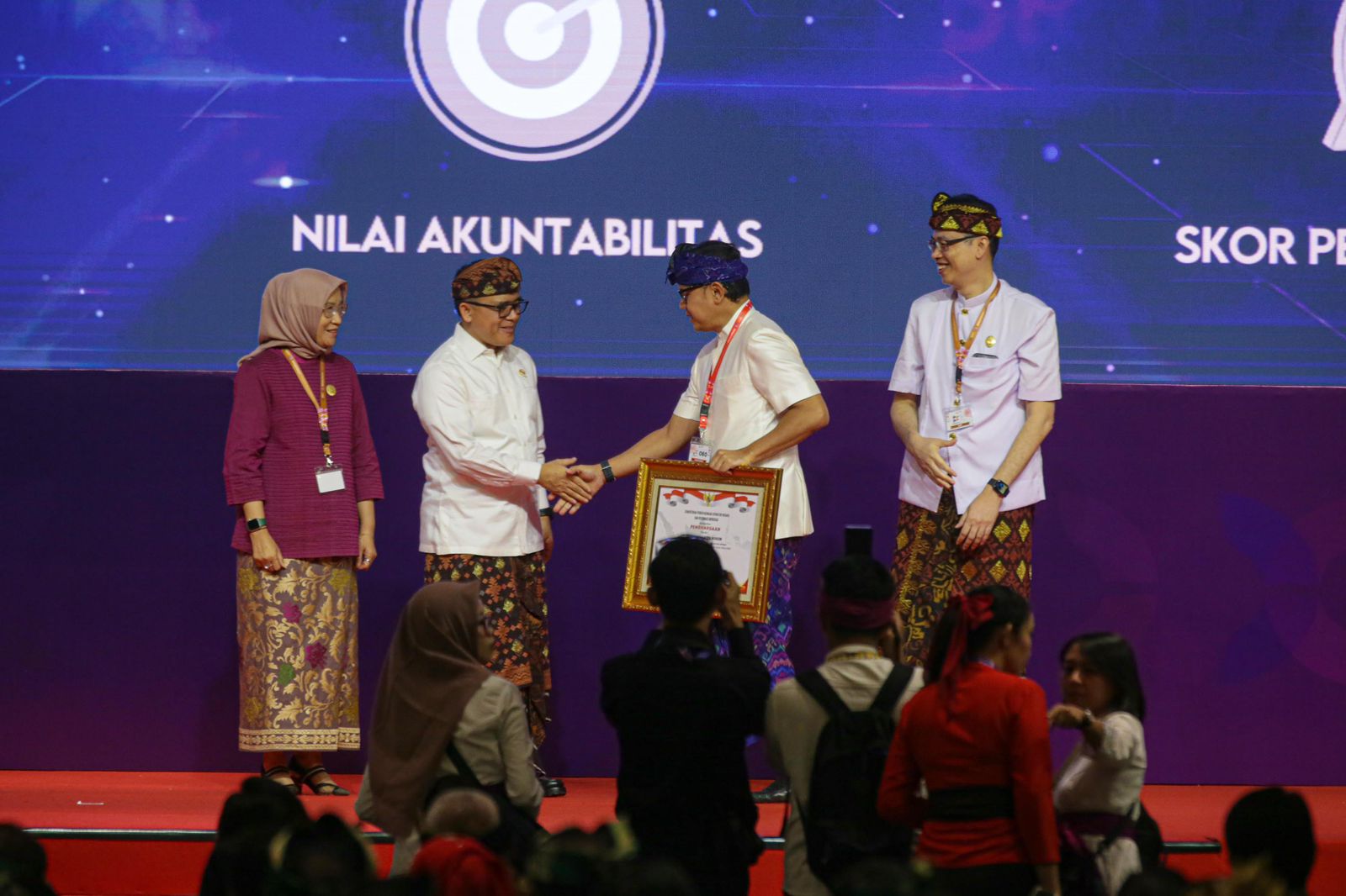 Wali Kota Bogor, Bima Arya secara simbolis menerima penghargaan yang diserahkan Menteri Pendayagunaan Aparatur Negara dan Reformasi Birokrasi (PANRB), Azwar Anas di ajang Apresiasi dan Penyerahan Hasil Evaluasi SAKIP, Reformasi Birokrasi dan Zona Integritas di Balai Nusa Dua Convention Center, Bali, Rabu (6/12/23).