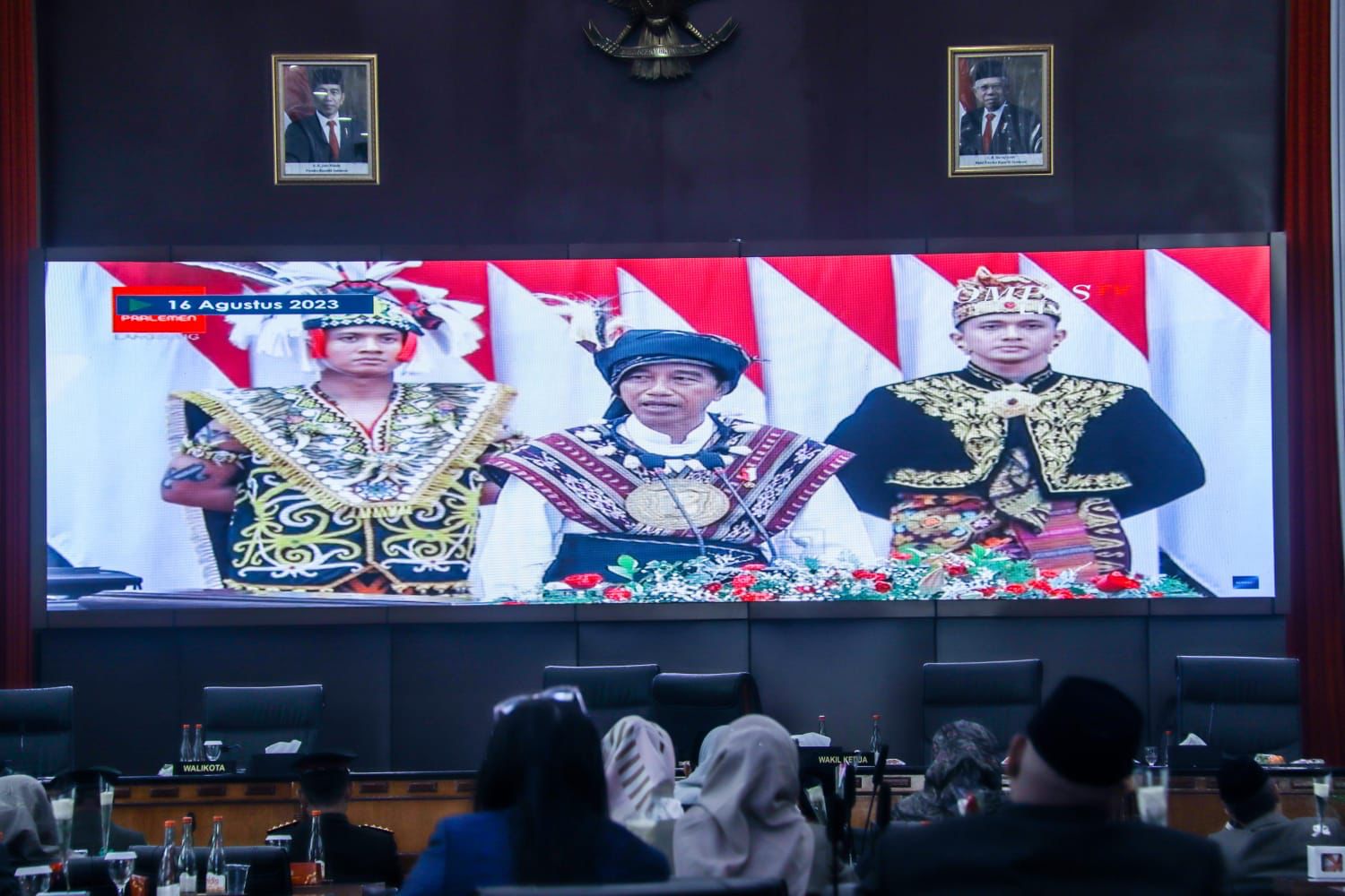 BOGORCHANNEL.ID– Wali Kota Bogor, Bima Arya didampingi Wakil Wali Kota Bogor, Dedie A. Rachim dan Sekretaris Daerah (Sekda) Kota Bogor, Syarifah Sofiah serta pimpinan DPRD dan Forkopimda menghadiri Rapat Paripurna Istimewa DPRD Kota Bogor dalam rangka mendengarkan pidato kenegaraan Presiden Republik Indonesia, Joko Widodo dalam Sidang Tahunan MPR RI secara daring di DPRD Kota Bogor, Rabu (16/8/23).