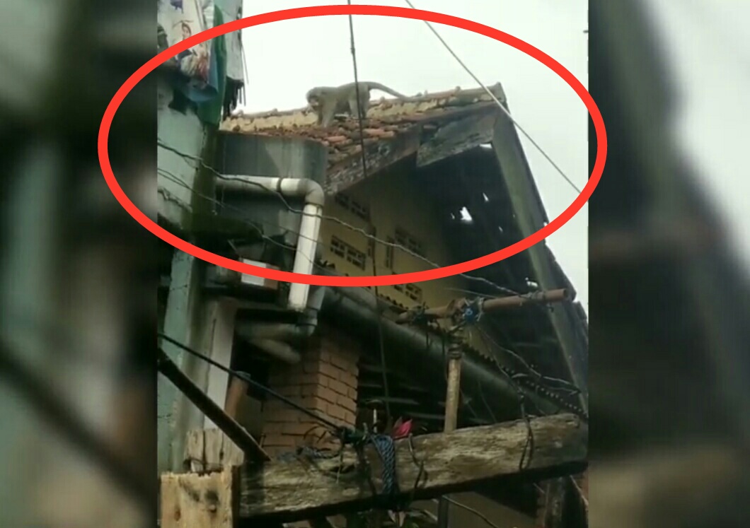 Monyet berusia dewasa itu berada diatas genting rumah milik warga. Bahkan, kelakuannya membuat geram pemilik. Sebab Monyet berwarna abu itu merusak genting hingga atap rumah warga bocor, selain berani pecahkan kaca.